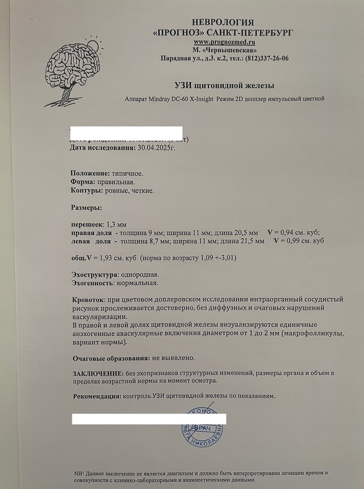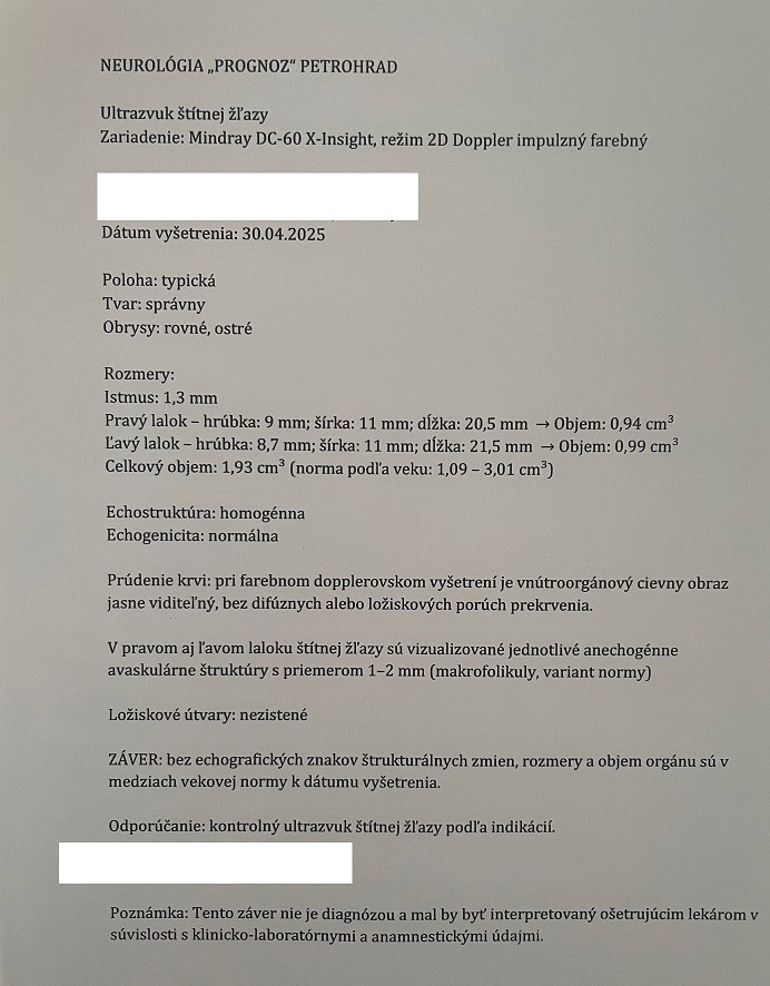 Výsledky ultrazvuku štítnej žľazy boli v poriadku. Lekár nenašiel žiadne štrukturálne zmeny, zápalové prejavy ani iné odchýlky, ktoré by naznačovali problém so samotnou štítnou žľazou.